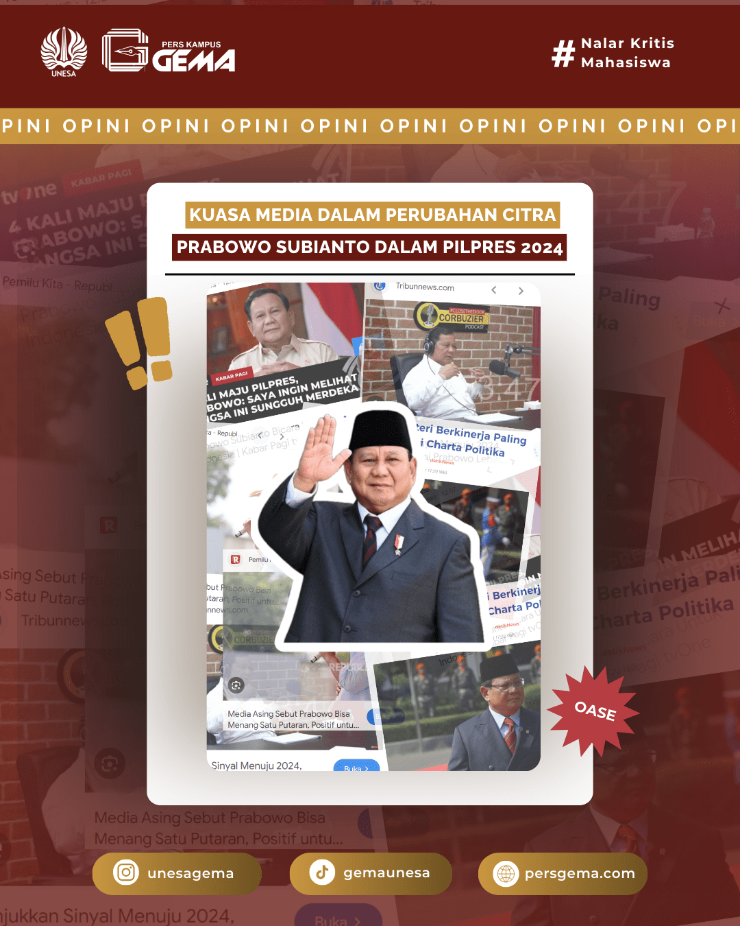 Peran media dalam kancah politik Indonesia tidak bisa dipandang sebelah mata. Setiap gerakan, pernyataan, dan langkah politikus selalu diawasi, diliput, dan disebarkan oleh media, membentuk persepsi publik terhadap figur-figur tersebut. Salah satu contoh nyata adalah perubahan citra Prabowo Subianto menjelang Pemilihan Presiden (Pilpres) 2024. Dari seorang tokoh yang pernah dianggap kontroversial, Prabowo kini tampil dengan citra yang lebih positif, dan media memiliki andil besar dalam transformasi ini. Transformasi dari seorang yang kaku dengan tingkah lakunya berubah menjadi gemoy sehingga bisa menarik perhatian publik. Hal ini bisa kita lihat dari hasil quick count Prabowo-Gibran pada pemilihan presiden 2024. Tercatat dari beberapa lembaga survei, Prabowo-Gibran mendapatkan sekitar 57-59% suara. Lembaga Survei Indonesia (LSI) mencatat bahwa pasangan ini memperoleh 57.45%, sementara Poltracking Indonesia mencatat perolehan 58.87%, dan Indikator Politik Indonesia menunjukkan angka 58.03%. Perolehan suara ini menunjukkan peningkatan signifikan dibandingkan dengan Pilpres 2019, dimana Prabowo Subianto, yang saat itu berpasangan dengan Sandiaga Uno, hanya memperoleh sekitar 44.5% suara. Apalagi perlu diingat jika pemilihan presiden 2024 terdapat 3 kandidat yang maju sebagai calon presiden, tentu saja hal ini lebih banyak dibandingkan dengan pemilihan presiden 2019 yang hanya terdapat 2 kandidat.